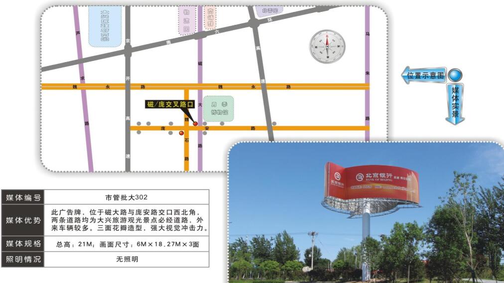 | 亦莊雙面單立柱廣告 媒體位置:榮華北路、榮華南路、西環(huán)北路、東區(qū)科創(chuàng)五街 媒體規(guī)格:12m*4m*2面 |