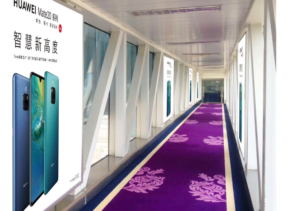 媒體位于T2航站樓9個廊橋移動段,100%覆蓋所有國內出發、到達旅客。