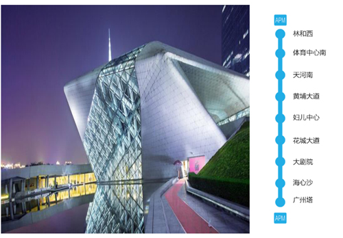 APM線 ——城市中軸觀光線:APM線為全地下、全封閉、無人駕駛的短線客運系統,承擔珠江新城核心區的交通疏導功能。線路整體呈南北走向,總長約3.94公里,沿途串起廣州塔、海心沙、珠江新城與天河商貿區,實現林和西至廣州塔之間的短距離軌道快速通行。其中,黃埔大道至歌劇院站更是與廣州新中軸的花城廣場地下建筑連通,形成與地面各大商貿建筑的無縫鏈接。