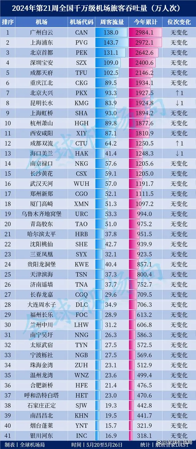 2024年第21周全國千萬級(jí)機(jī)場(chǎng)旅客吞吐量出爐!(第21周:5月20日至5月26日)上海浦東機(jī)場(chǎng)以143.7萬人次的周客流量連續(xù)8周拿下首位,與上周相比,客流量減少了2.4萬人次。從累計(jì)客流方面來看,上海浦東機(jī)場(chǎng)將其與廣州白云機(jī)場(chǎng)的差距進(jìn)一步拉近至12萬人次。北京大興機(jī)場(chǎng)則是在第21周實(shí)現(xiàn)了對(duì)昆明長水機(jī)場(chǎng)的反超,將累計(jì)客流的排名提升至第7位。成都雙流反超了海口美蘭,全國排名提升至第12位。